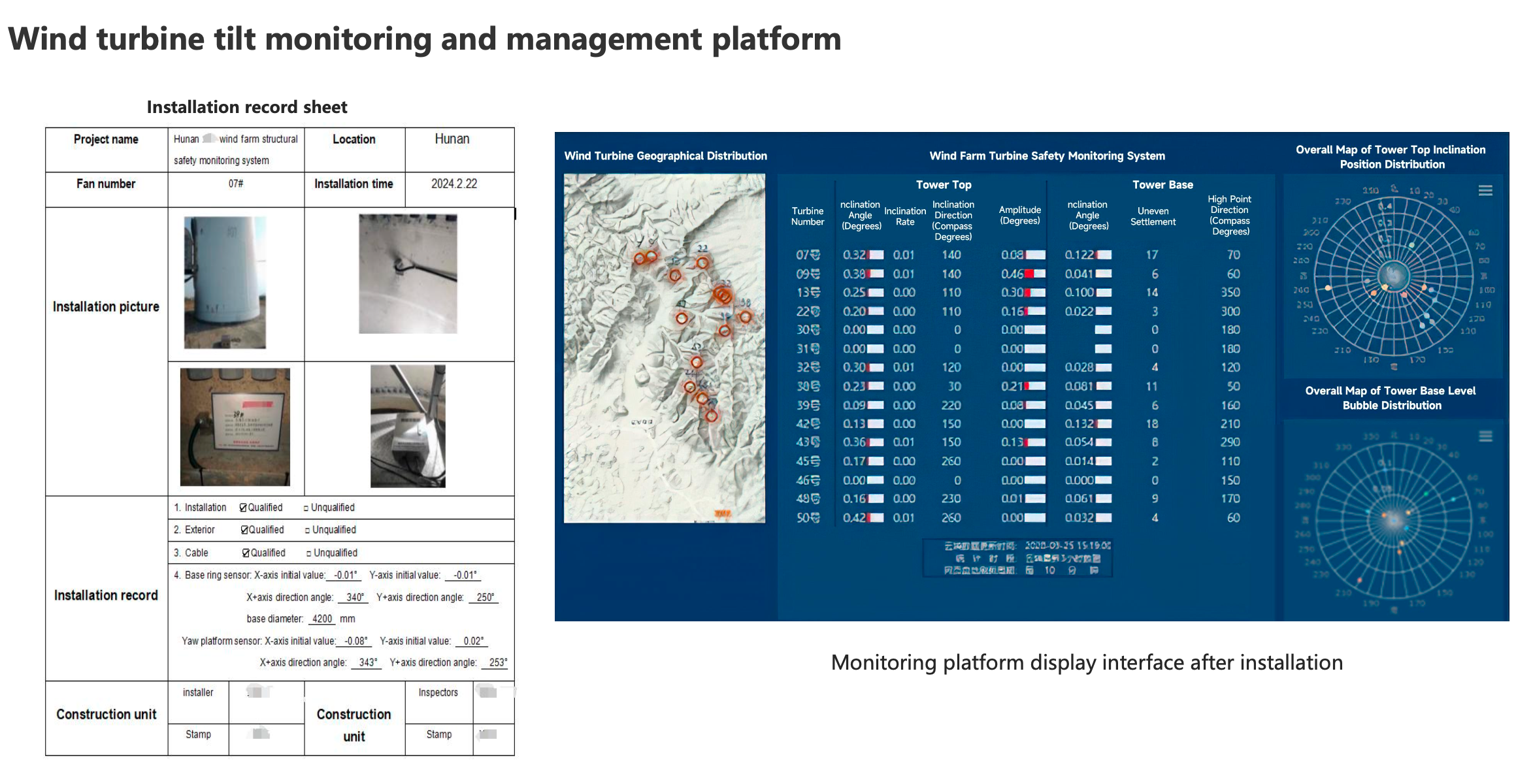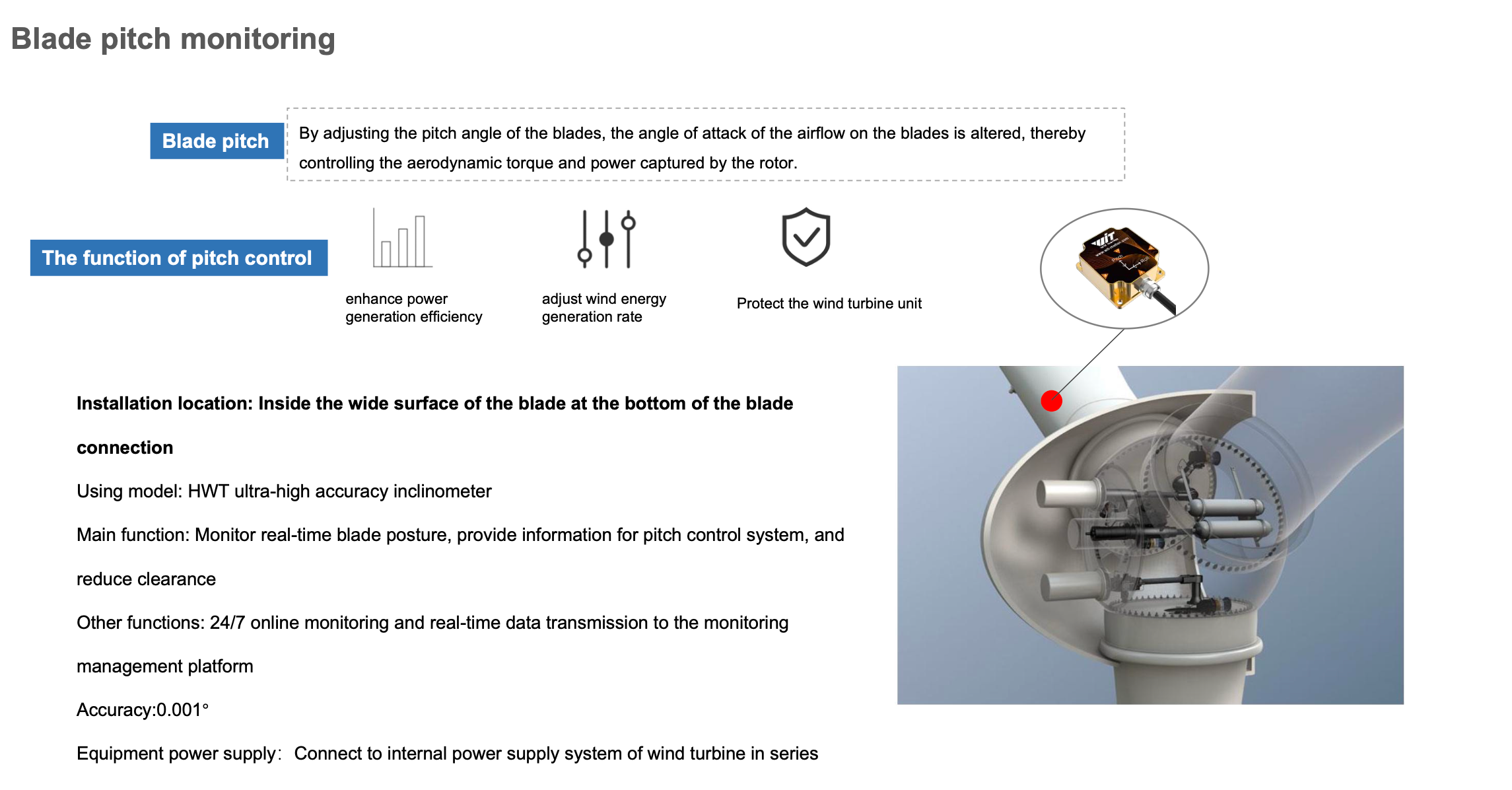 Wind turbines are key equipment in wind farms. The components of wind turbines are generally large in size, weight, and material loss, and wind farms are generally built in uninhabited areas. Modern wind turbine towers integrate sensors, signal processing, computers, and new materials. and other new technologies to prevent wind turbines at high altitudes from tilting, which threatens the normal operation and safety of power towers. It is necessary to use tilt sensors to monitor the verticality of wind turbines for a long time. Once the tilt exceeds the safe value, , early warning can be provided in time, and personnel can be notified for inspection and maintenance, thereby ensuring the stable progress of daily power generation work.