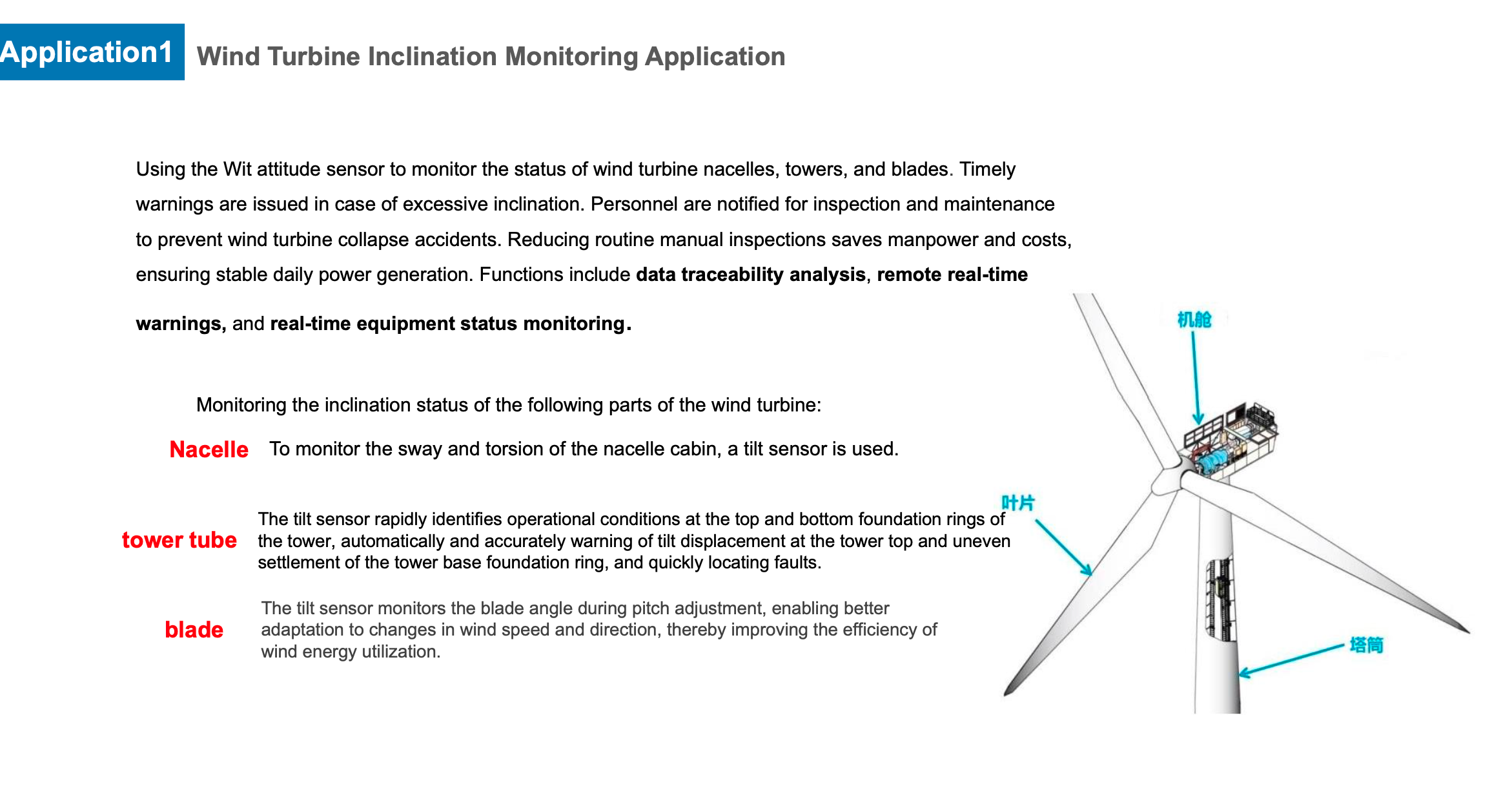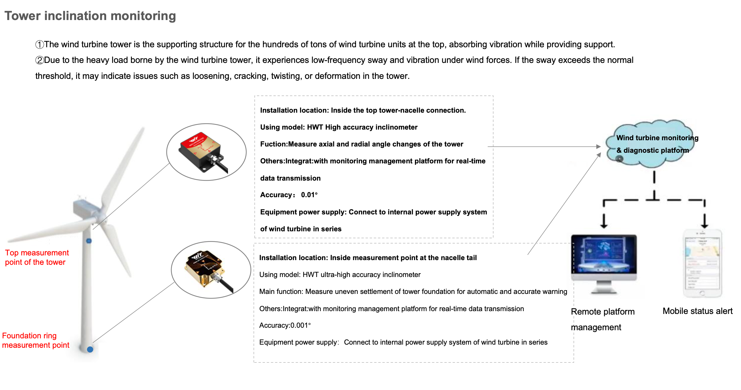 Wind turbines are key equipment in wind farms. The components of wind turbines are generally large in size, weight, and material loss, and wind farms are generally built in uninhabited areas. Modern wind turbine towers integrate sensors, signal processing, computers, and new materials. and other new technologies to prevent wind turbines at high altitudes from tilting, which threatens the normal operation and safety of power towers. It is necessary to use tilt sensors to monitor the verticality of wind turbines for a long time. Once the tilt exceeds the safe value, , early warning can be provided in time, and personnel can be notified for inspection and maintenance, thereby ensuring the stable progress of daily power generation work.